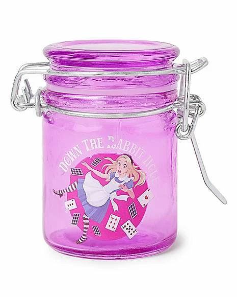 Stash your tiny treasures in this pretty pink Alice in Wonderland jar. Featuring an image of Alice going down the rabbit hole, this glass jar will make a lovely addition to any room.