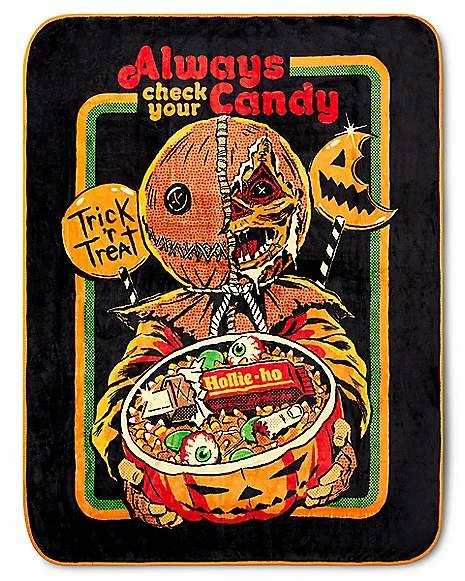 Bundle up for your favorite horror film with your favorite character when you get yourself this officially licensed Always Check Your Candy Fleece Blanket. This stylish and cozy fleece features Sam from Trick ‘r Treat on it and is perfect for horror movie night on the couch.