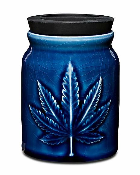 Stash your stuff in style with this blue ceramic storage jar featuring a leaf print. It makes the perfect touch to dorm rooms, bedrooms, and just about anywhere else.