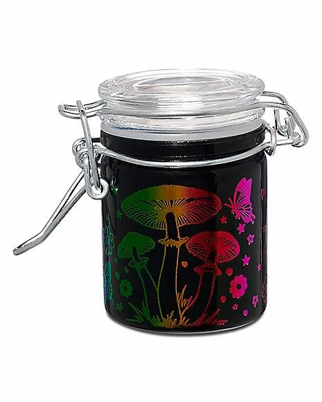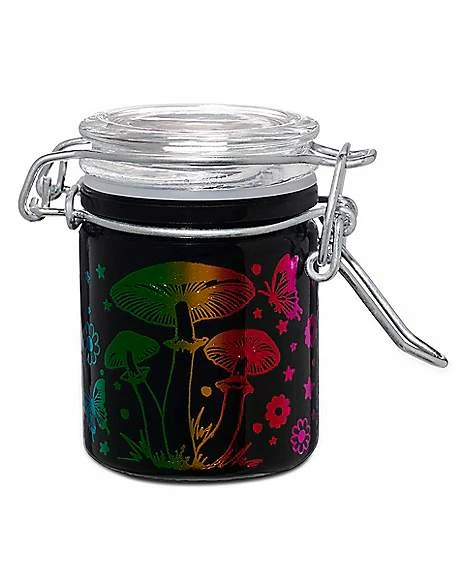 Store your most precious goods in style in this rainbow mushrooms stash jar! This striking stash jar is the perfect way to make sure your belongings stay safe and dry.
