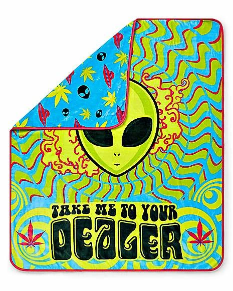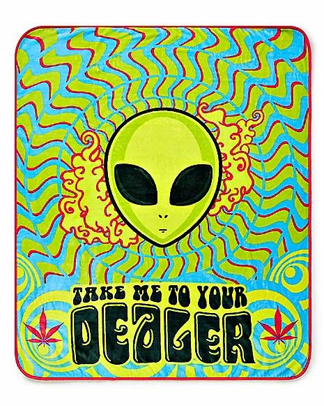 Stay warm and cozy all throughout your next smoke sesh with this Take Me To Your Dealer Alien Fleece Blanket. This blanket features a trippy design with an Alien head on the front and is perfect for bundling up and beating the cold this winter.Β