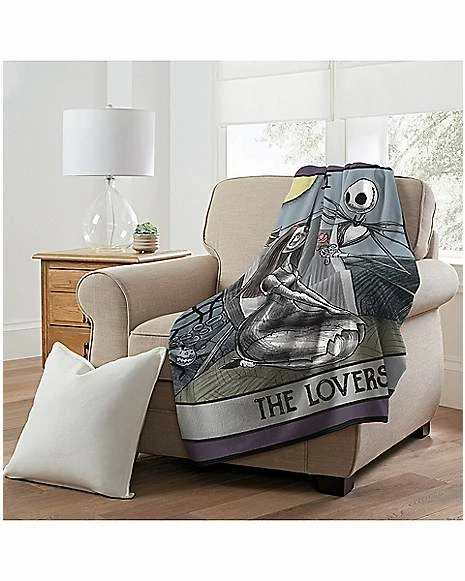 Canβt get enough of Jack Skellington and Sally? This officially licensed The Nightmare Before Christmas fleece blanket has a tarot card theme and features an image of the lovers from Halloween Town. Β